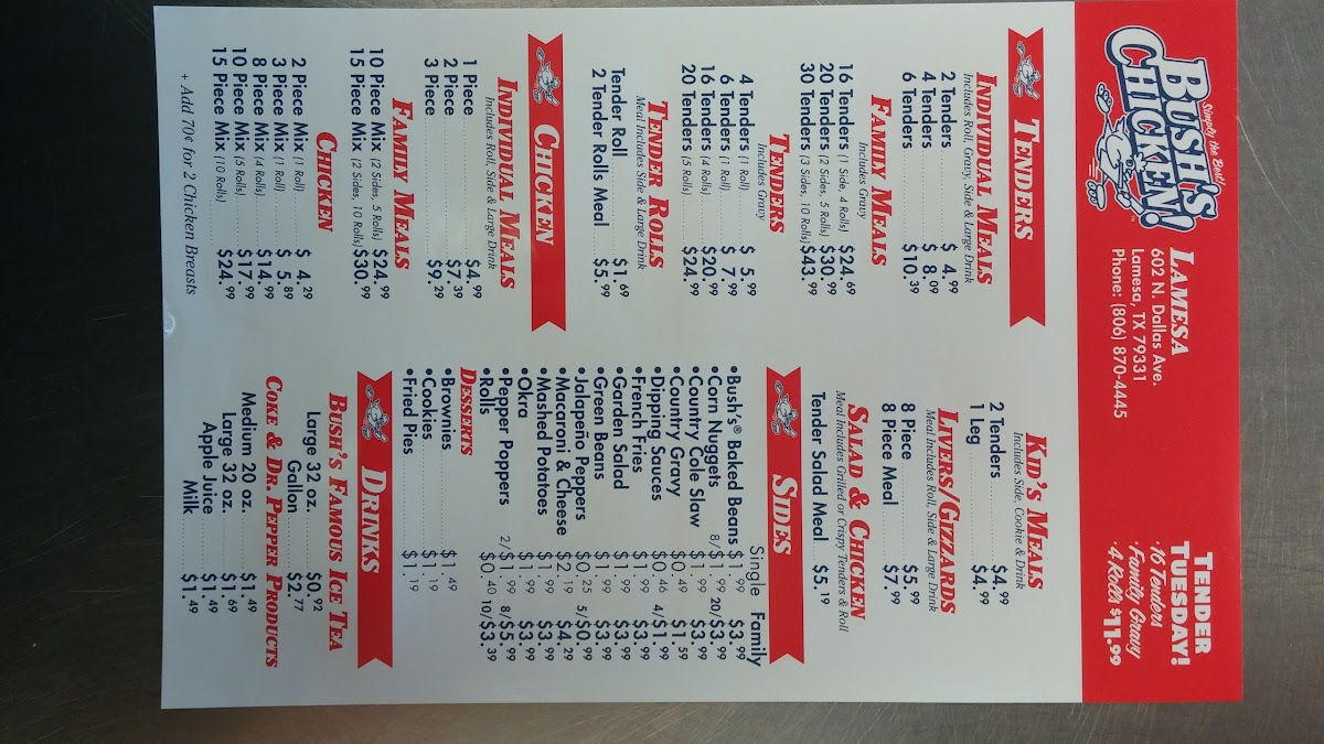 Customer favorites like the tender rolls and fried okra amplify the experience. With great service and a friendly environment, Bush's Chicken - Lamesa is the place to satisfy your cravings!